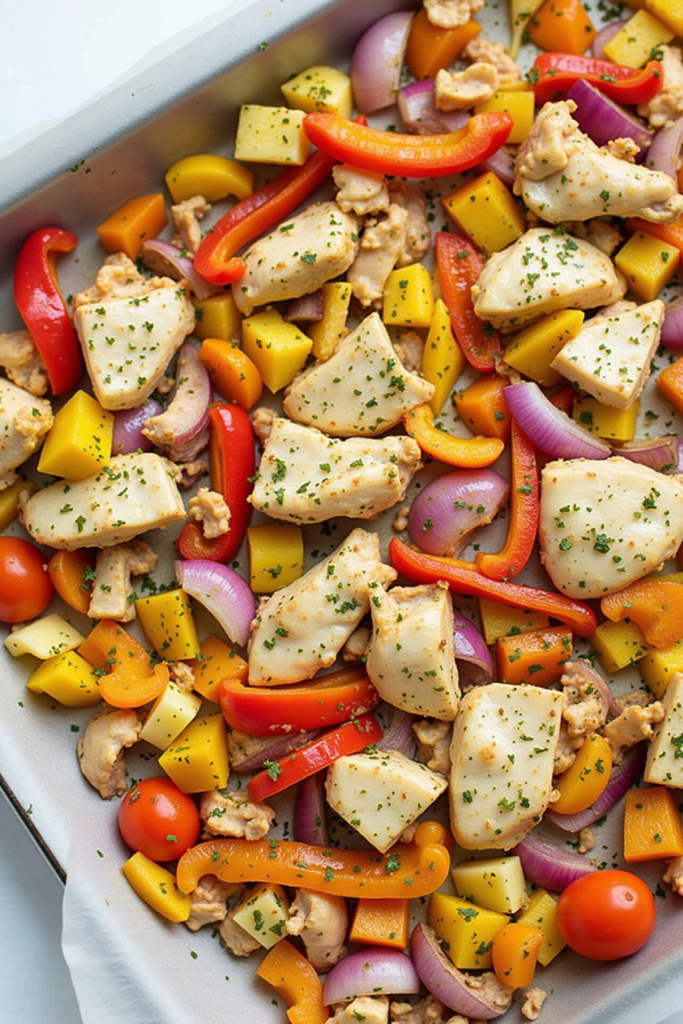 - On your sheet pan, arrange the chicken, bell peppers, red onion, and pineapple chunks. Pour the sauce over everything and toss well to coat.